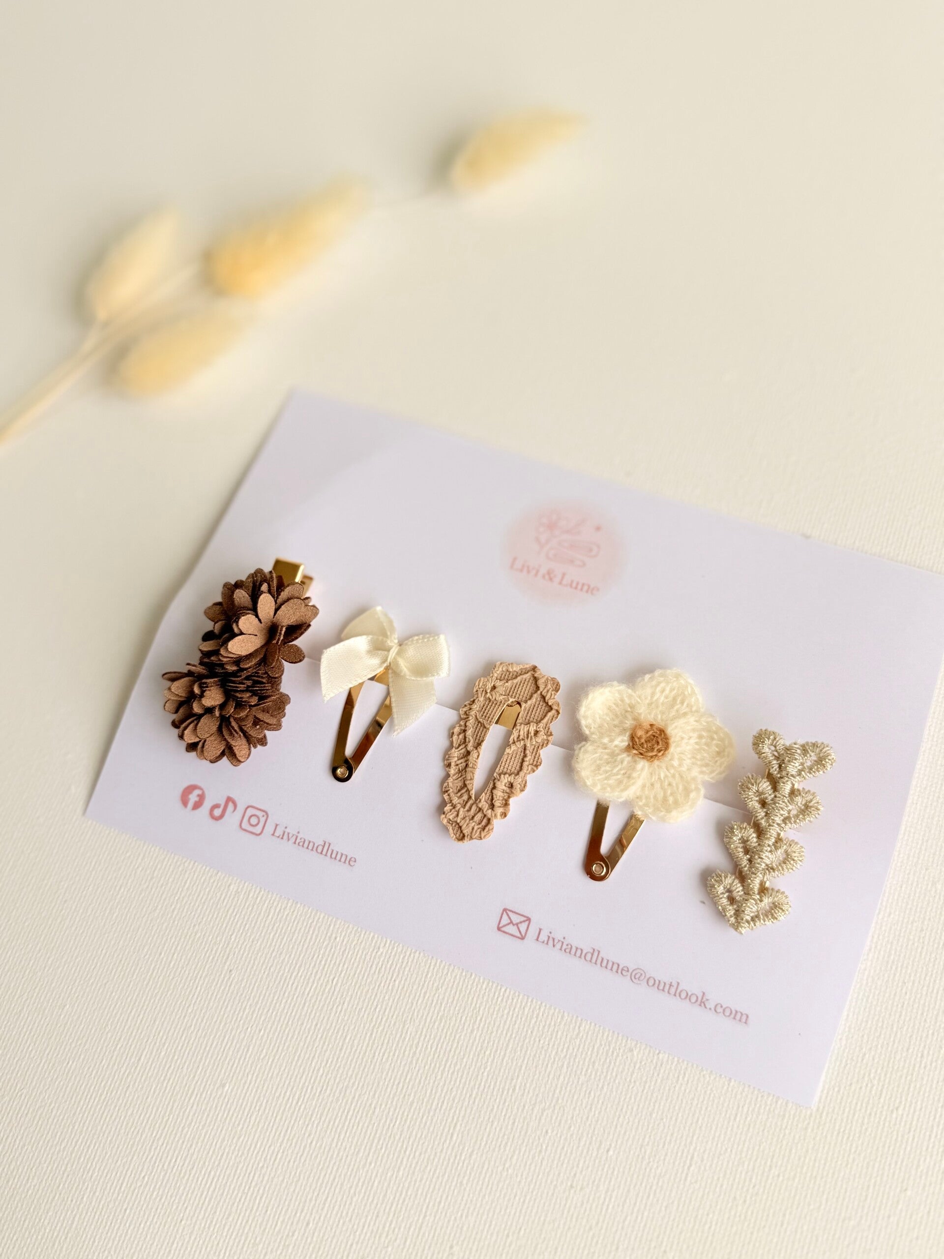 De Soft Hazel set bestaat uit drie klikklak speldjes en twee alligator speldjes in warme hazelnoot- en beigetinten. Licht en comfortabel, ideaal voor zowel de kleinste plukjes als stevigere lokjes.